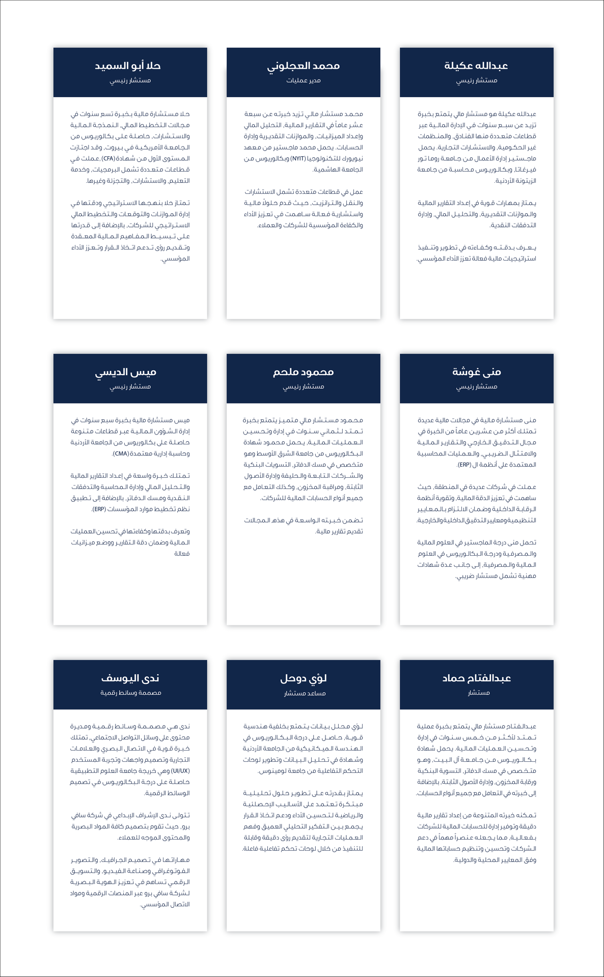 يضم فريقنا التنفيذي مستشارين متخصصين في الاستشارات المحاسبية والمالية, ويتميزون بخبرة واسعة واحترافية عالية لضمان تقديم حلول فعالة وتحقيق أفضل النتائج لعملائنا